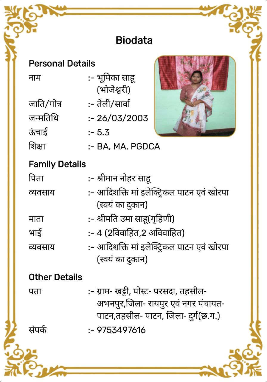 नाम – कु. हेमलता साहू जन्मतिथि – 03-01-1999 गोत्र – सोनबेर (कबीरपंथी) ऊँचाई – 5’0″ शिक्षा – बी.ई. (कंप्यूटर साइंस) व्यवसाय – निजी फर्म में सॉफ्टवेयर इंजीनियर(घर से कार्य) जन्मस्थान/गाँव – जरवाय पाटन दुर्ग (छत्तीसगढ़) पता – श्रद्धा विहार, बोरिया खुर्द, रायपुर पिता – स्वर्गीय श्री गजेंद्र साहू माता – श्रीमती गोमती साहू (पीडब्ल्यूडी में … Read more